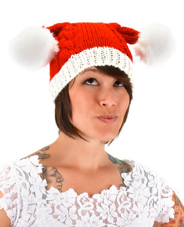 The Elope Knit Santa Hat is a 100% wool and all character style. Featuring a white band of wool around the lower portion of the hat that scales vertically into red and "T"'s into two separate legs with large white pom-poms at their ends. This is a great and original take on an old tradition of Christmas hats. The hat is one size fits most but is stretchy so will fit a wide variety of head sizes