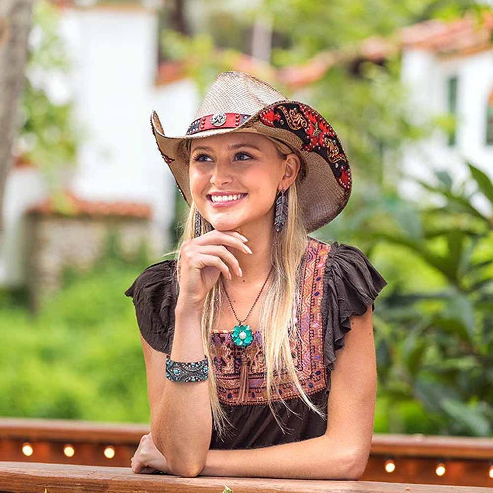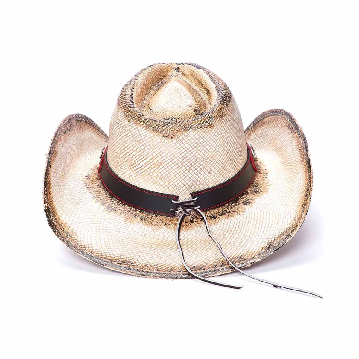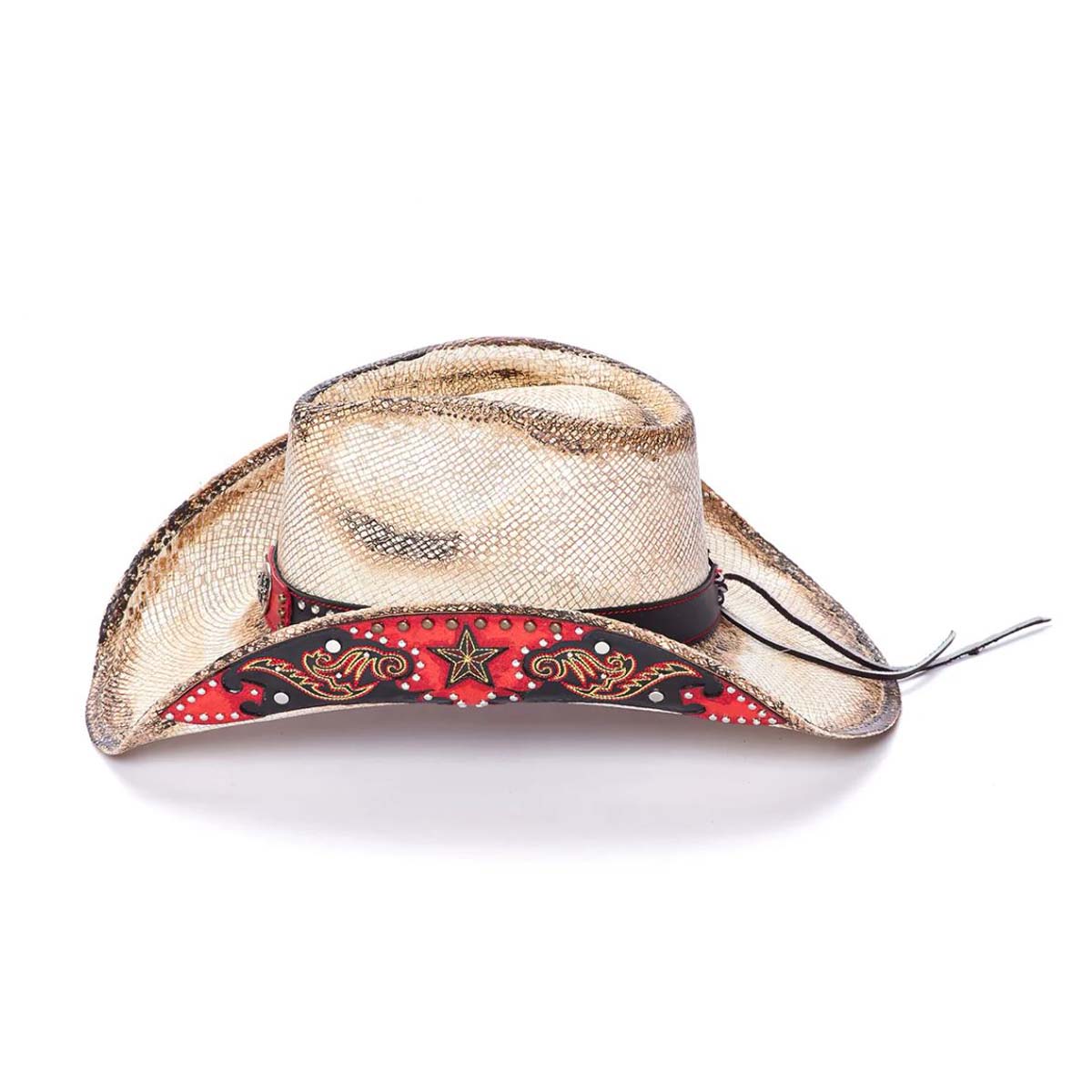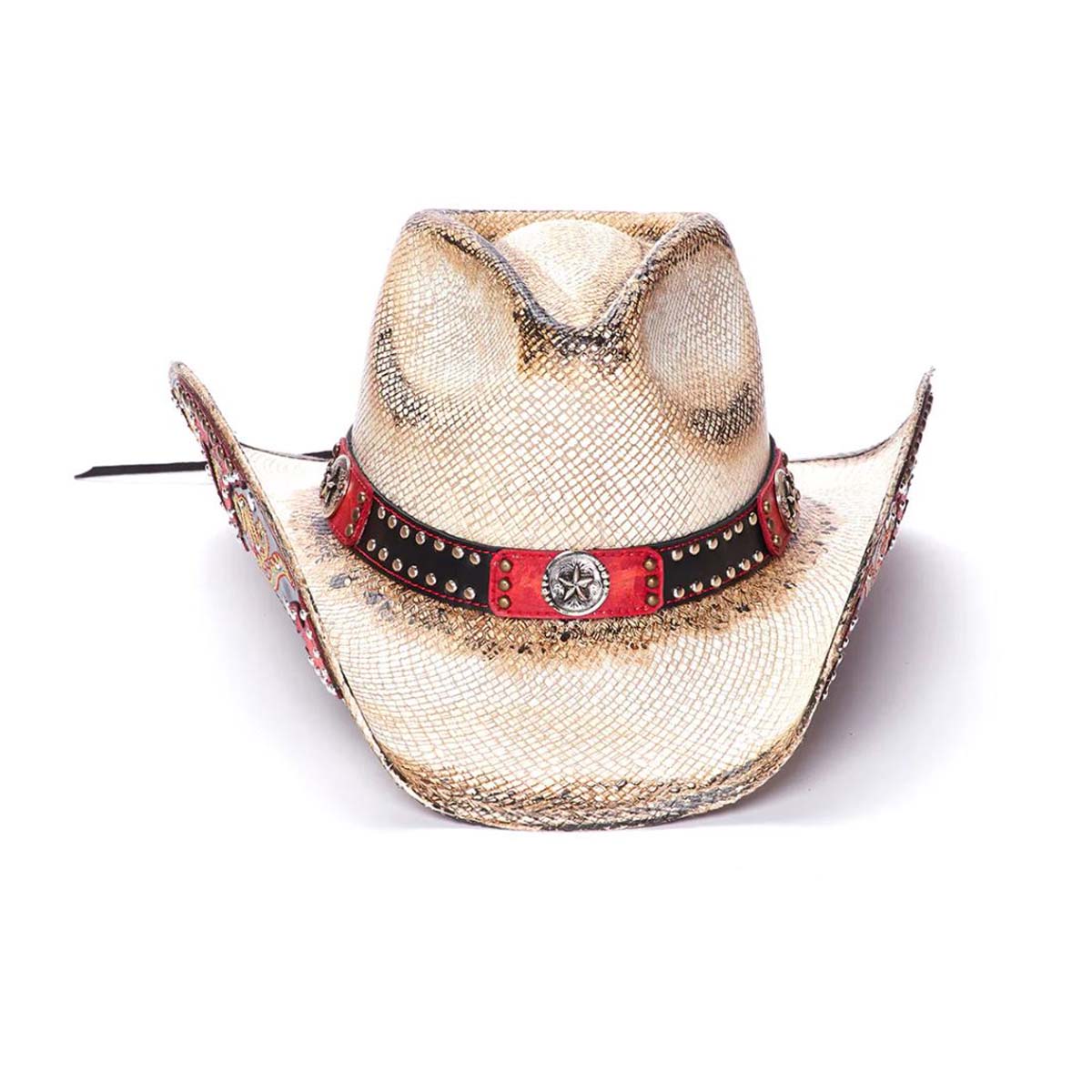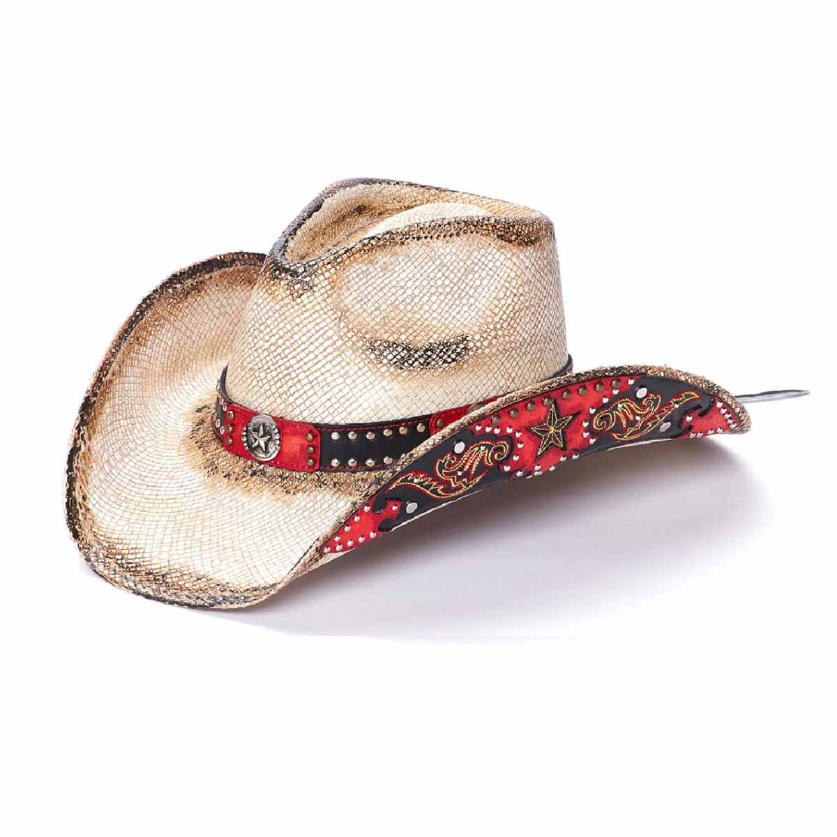 The Red Rebel hat from the Stampede Collection channels authentic Western spirit with genuine Panama straw construction and rugged detailing. A genuine leather band adorned with mini studs frames the crown, while a 3.75-inch brim provides classic sun protection. The signature star buckle and star design motif, complemented by mini studs beneath the rolled brim, deliver unmistakable Stampede character. Built for those who embrace bold style and timeless cowboy heritage.