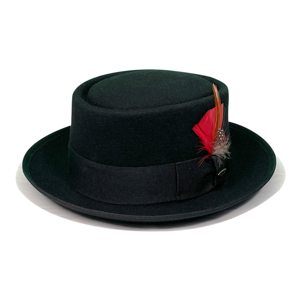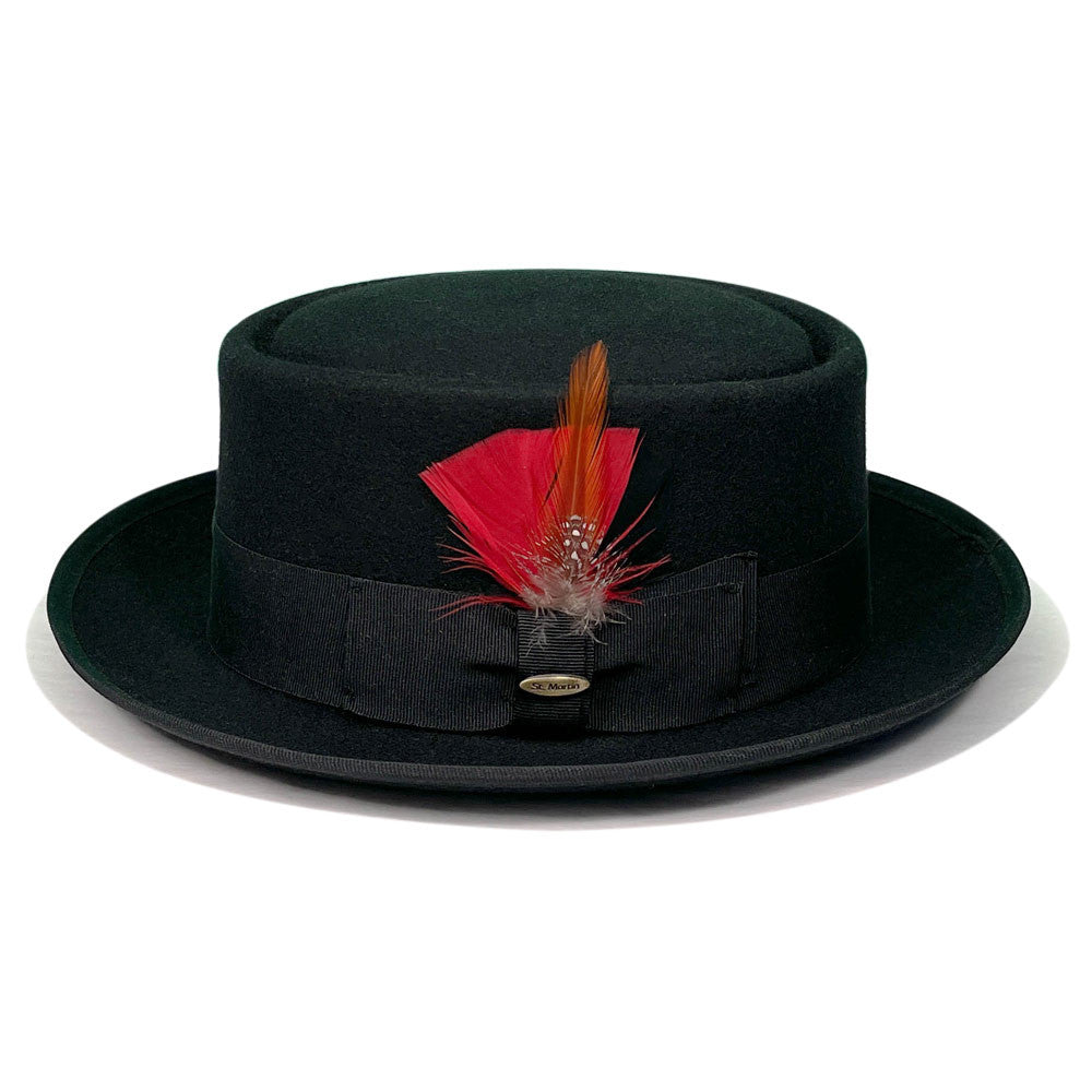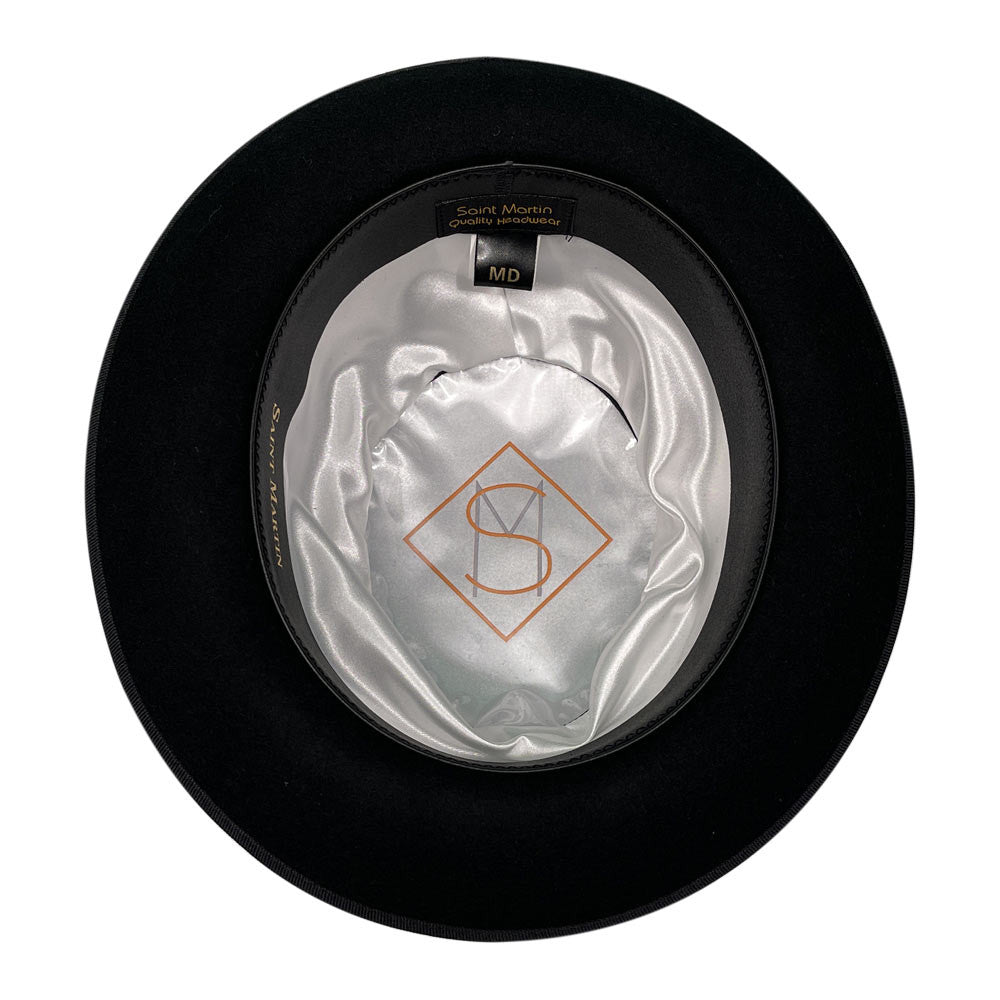 The Saint Martin Black Wool Felt Pork Pie Hat is a time-tested and stylish piece of headwear! Made of 100% wool felt, the 2" brim comes trimmed in grosgrain, and the crown includes a grosgrain band culminating in a bow with feather and Saint Martin pin at the left hand side. The crown is formed in the traditional pork pie telescoping style, while inside you will find a faux-leather sweatband, and a liner with the SM emblem imprinted.