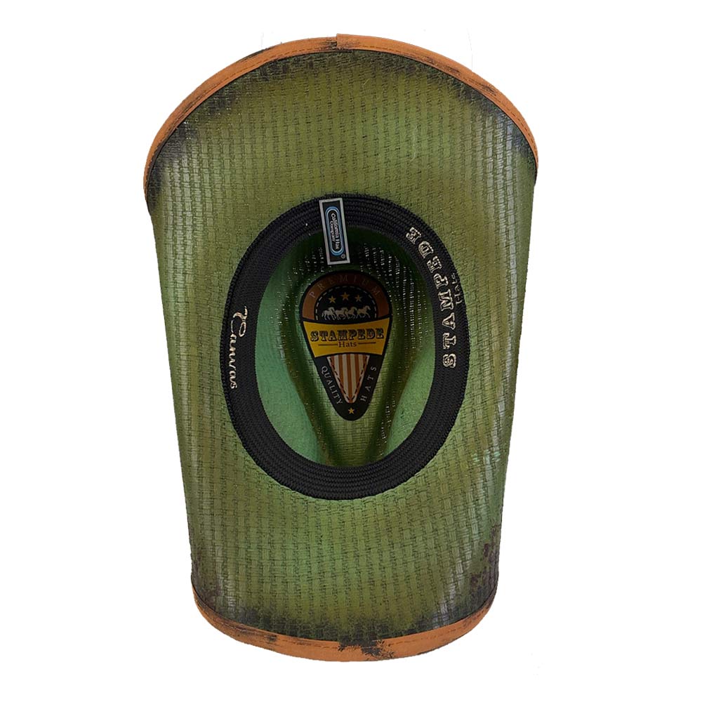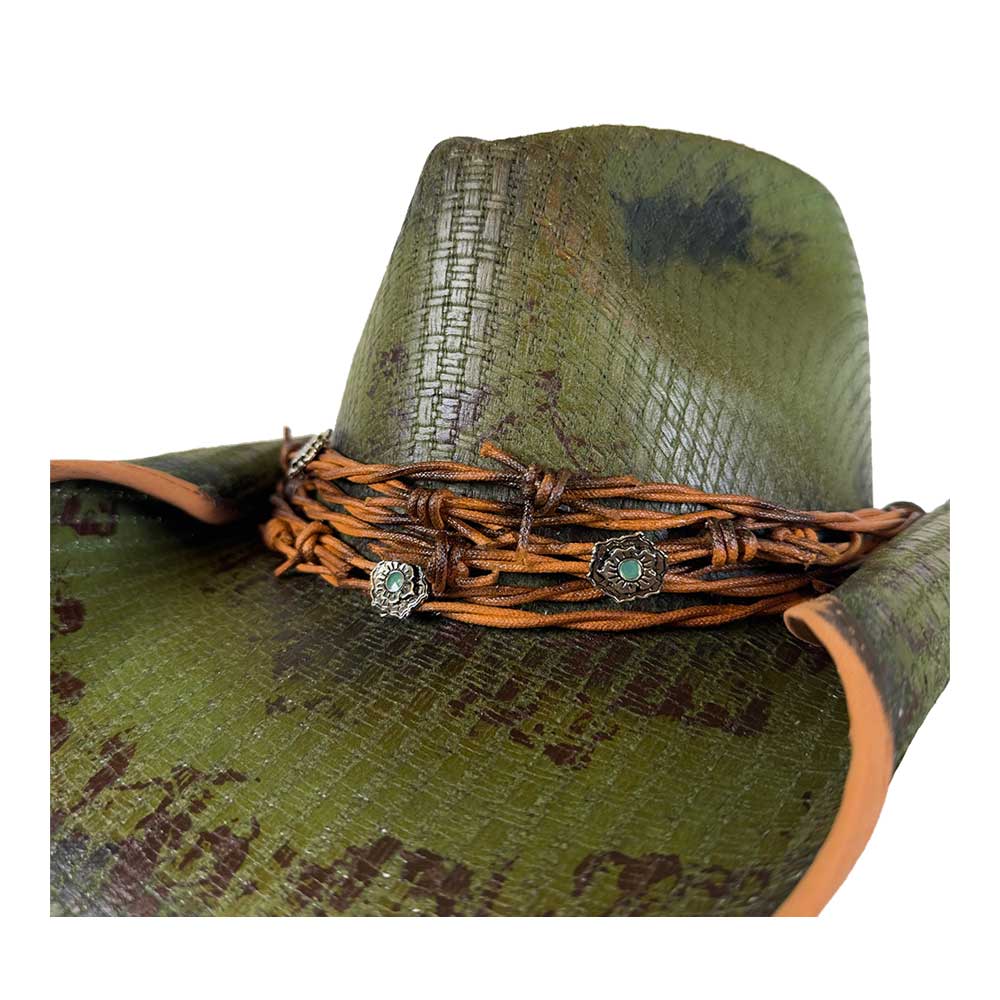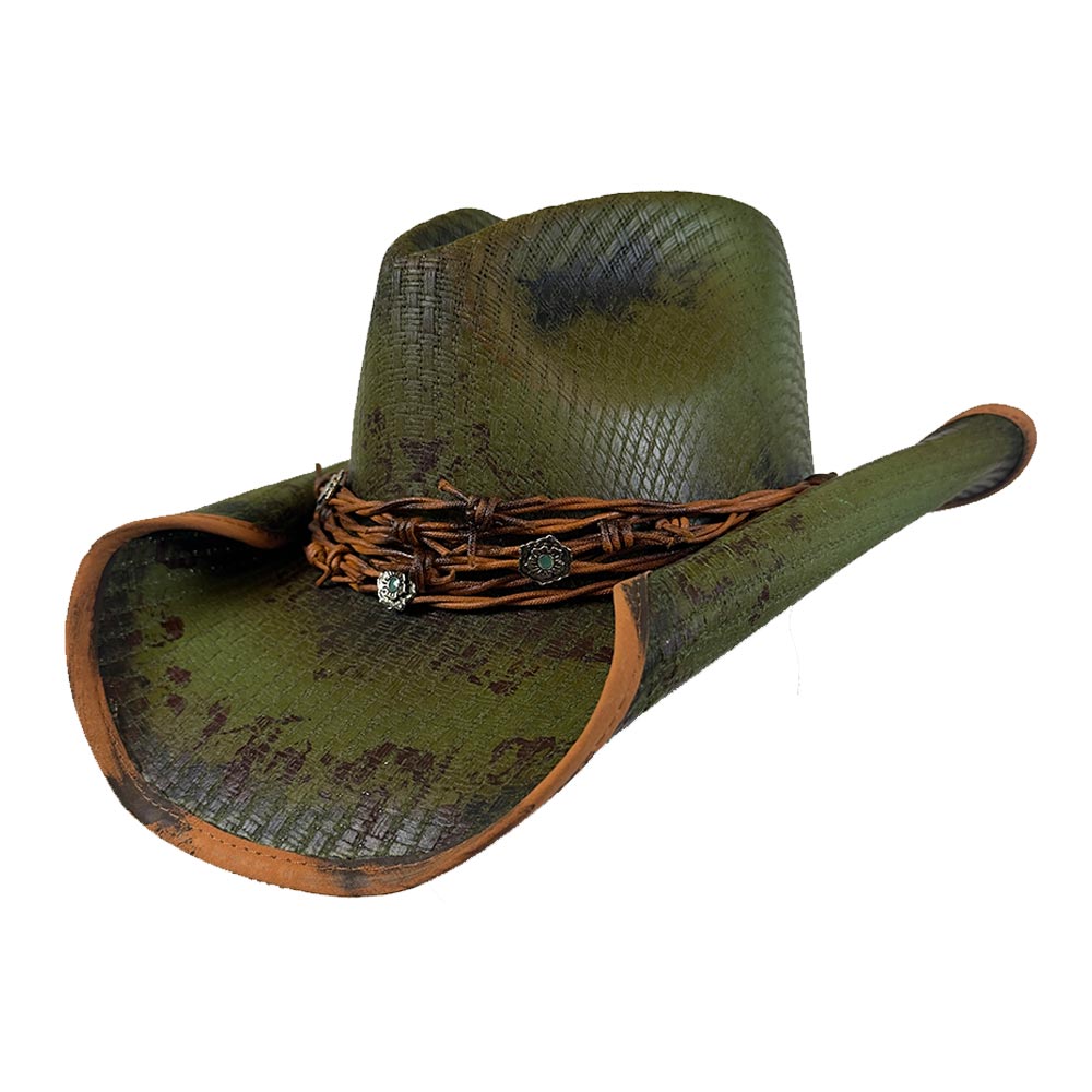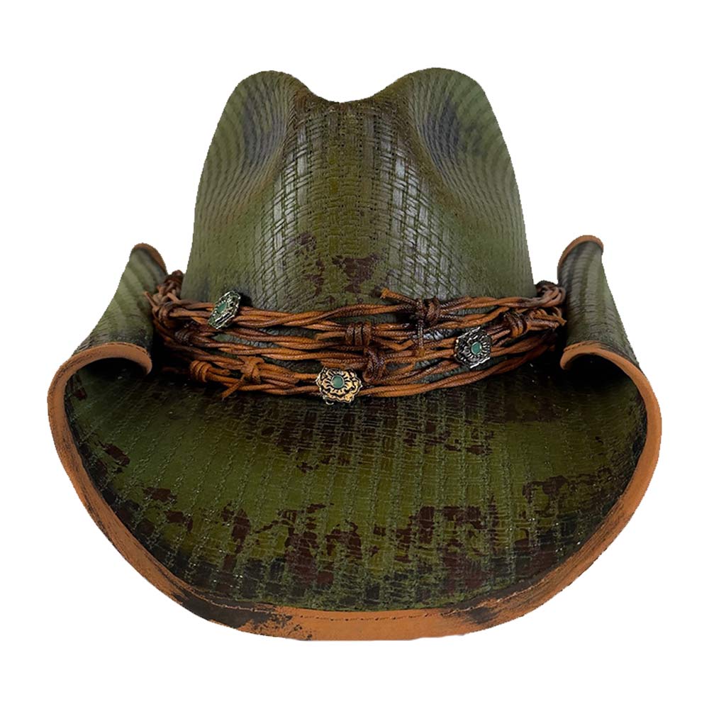 Say Hasta La Vista to boring hats with this Stampede Hats Cowboy Hat. Crafted from premium canvas, it comes trimmed with braided leather cords and mini buckles giving the appearance of barbed wire. The 3.75 inch brim will keep your face shaded and the worn design will make it look like it's been your trusty hat for some time.