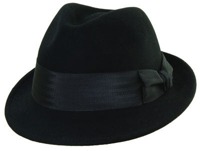 Inspired by Frank Sinatra's style, this fedora is classy and wears well on any gentleman. It's made of black felt and has a black hatband that is tied into a bow on the side. This hat is great for an upscale night on the town.