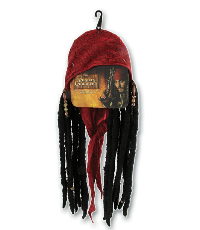 The Captain Jack Sparrow pirate scarf with dreads is a great accessory to any man or woman's pireate costume. It consists of a soft red headscarf and has 14 dreadlocks sewn to it. The scarf ties in the back for adjustability and there are two beaded braids for effect.