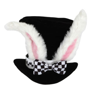"Oh dear! Oh dear! I shall be too late!" So says the white rabbit as he leads Alice down the rabbit hole to Wonderland. Whatever you are late for, you can be elegantly late with this black velvet top hat. It comes with two 11" long faux furry ears, a checkered bow tie, and matching headband to complete the ensemble. Also features a velcro size adjuster for optimum fit.