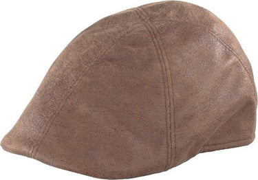 The Henschel brown faux leather duckbill cap is a lightweight leather imposter with real style. Made of 100% polyester and sewn into 6 triple-stitched panels, the look and even the texture seem like the real thing. This hat has it's advantages in being polyester however. For one it is very light and durable, it is even softer than some of the more worn in leather styles we have seen, and the cost can't be beat. The inside is lined in black and the sweatband is quadruple stitched for reinforced durability.
