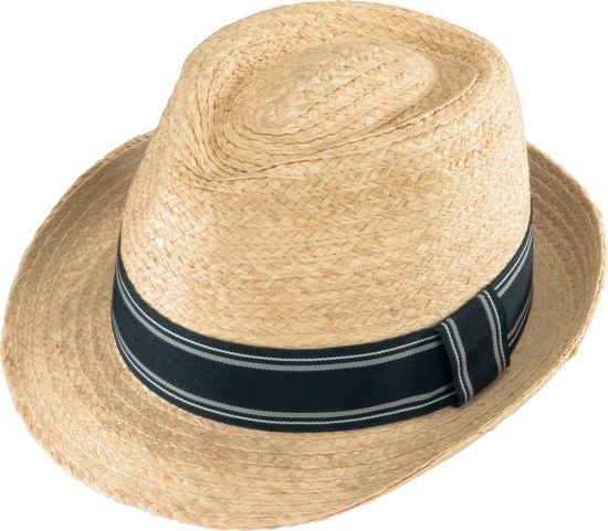 The Henschel raffia fedora is a great hat that is made with durable 100% raffia fibers. It is a soft, sturdy, and packable hat and features a stiped black grosgrain ribbon band for trim. It has a comfortable sweatband inside and will fit up to an XL head size.