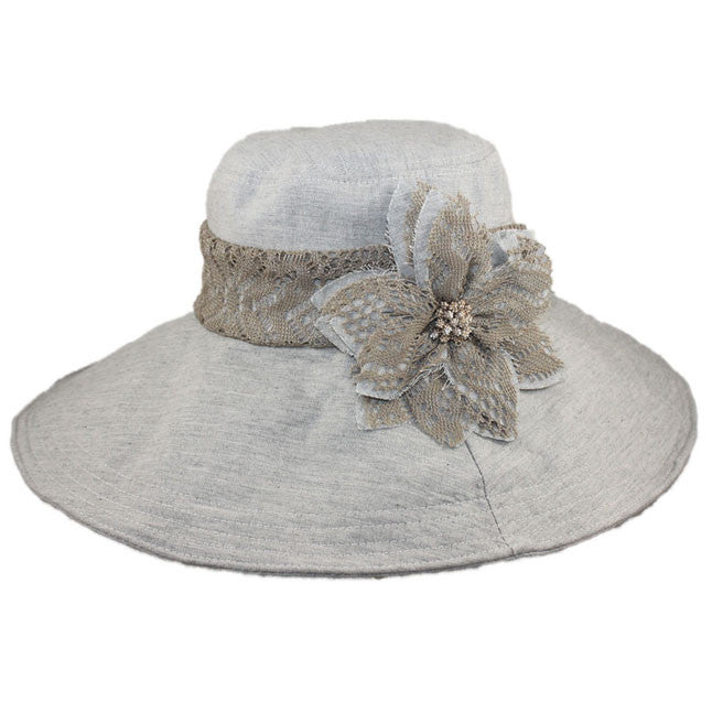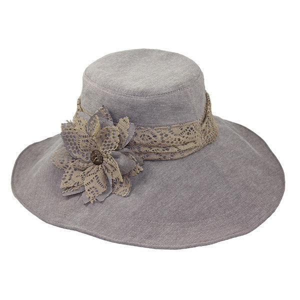 This soft light weight 5 “ brim fashion hat is accented with a perforated cotton lace band and a brim edge with wire that allows the wearer to easily shape the hat. The flower adornment can be easily removed for different looks.