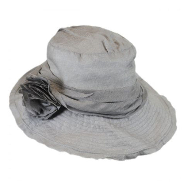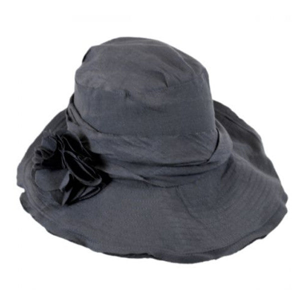 This is a lovely Rayon (65%) and Nylon(35%) blend hat with a slanted Brim that comes in four great color choices. The hat band looks like a soft ruffled scarf and has a floral pin that can be detached from the hat as you wish. This hat is extremely lightweight, is easily crushable and packable, and has a flexible wired brim which makes it good for easy transport and it is ideal for traveling. Available in charcoal, grey, pink and taupe.