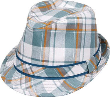 The Kenny K aqua plaid fedora is classic style with a modern look. With alternating panels of aqua, white, and mustard coloring, this hat has some pizaz! The 5" crown features a 1" band in matching style, that comes to an end with the Kenny K logo on the left side. It is made with 90% cotton and 10 polyester.