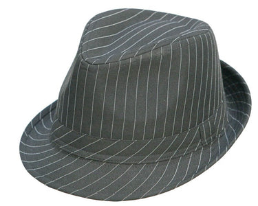 The Kenny K pinstripe fedora is a humble black style with white pinstripes and a selfsame hatband. It features a ribbon sweatband inside and lined with the Kenny K logo.