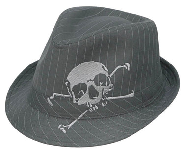 This black pinstriped stingy brim fedora is sure to make a statement. Simple in design but finished well with skull and crossbones embroidery, there is a ribbon sweatband inside and a liner with the Kenny K. logo.