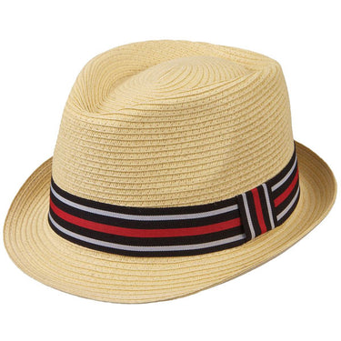 The Kenny K Two Tone Band Toyo Fedora Hat is a simple yet stylish look, made from lightweight and comfortable braided toyo straw. Featuring a 1.5" brim and 4" crown, this hat comes with a colorful black, grey, red striped band and a pinched crown.