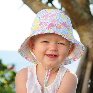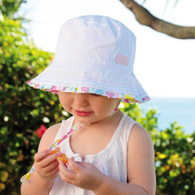 This precious cotton bucket hat is for the little girl on the go. 2 hats in one it has all the colors a girl could want. Pinks, whites, turquoise, yellows, and blues on one side with a simple white on the other. Comes with an adjustable chin strap and the maximum UPF rating of 50+