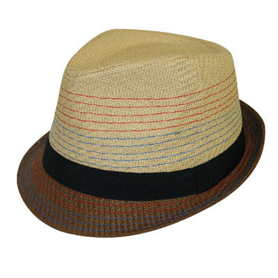 The Johnny Fedora is a smart paper braid hat that is tan and brown with red and blue stitching and a brown grosgrain ribbon for the finishing touch. It has an elastic comfort band inside with the maximum UPF 50+ sun protection rating.
