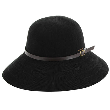 The Kooringal Leslie wide brim sun hat is a perfect style to take with you on the go! It is constructed of 100% polyester on the outside, but with a 100% cotton lining on the interior for maximum comfort. It features a wide, nearly 4" brim for great sun protection and an adjustable draw string on the inside to get the perfect fit. The style comes finished with a cute, thin faux leather trim around the base of the crown that ends in a buckle on the left hand side. Packable and crushable, this is a wonderful travel hat.