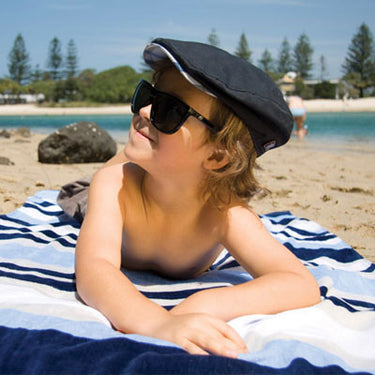 The pablo drivers cap is a slick little hat for your young man in an elegant navy color with an underbrim of blue plaid.