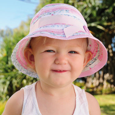 The Kooringal patchwork bell hat is an incredibly cute style for your little one. It gives full 360 degree protection from the sun and features a large ribbon bow stitched on the left side.