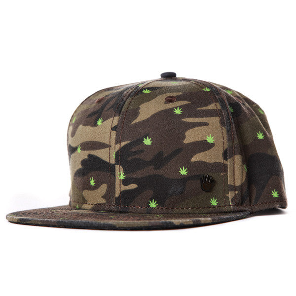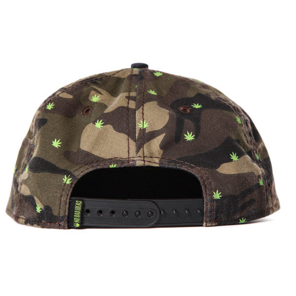 The No Bad Ideas Jax snapback is a modern day ballcap style that is great for everyday casual wear. This brown urban camo cap features little imprinted marijuana leaves, and as part of the No Bad Ideas family of products, on the inside of the hat is an inner lined stash pocket that can be used to store small objects.