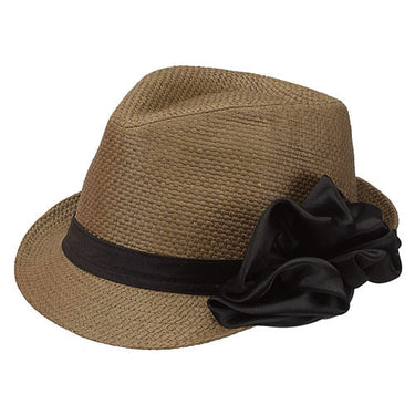 The Peter Grimm Tokio is a snappy stingy brimmed fedora constructed of woven toyo straw and finished with a black band. Comes decorated with a scrunched ribbon floret and has an artistic lining with an elastic band for universal fit.