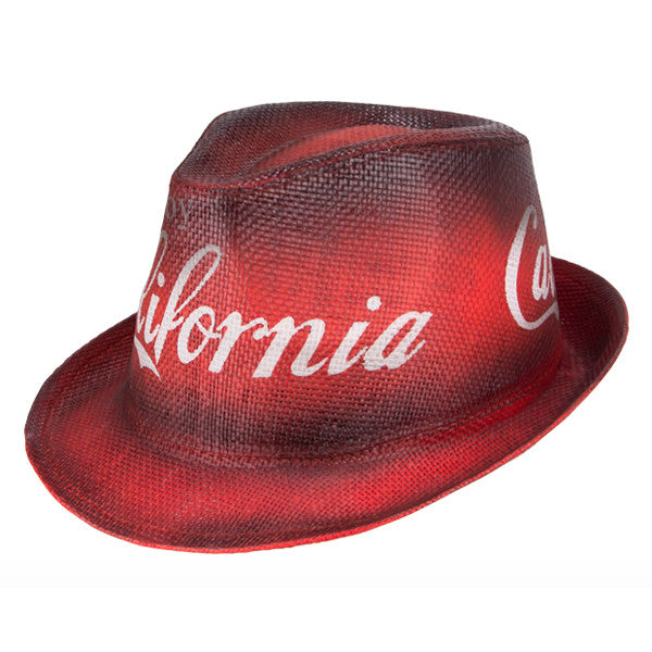 The Peter Grimm "Enjoy California" Fedora puts a sunny california twist on the classic "Enjoy Coca-Cola" slogan that we have all known for years. This red fedora is perfect for the summer and a unique twist to this timeless style that will continue to be around for years to come! The perfect hat to enjoy the beach, pool, or a good old fashioned weekend BBQ!
