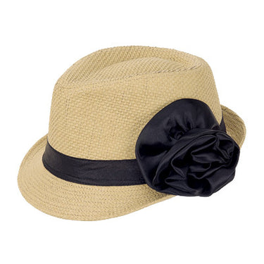 The Peter Grimm Tokio is a snappy stingy brimmed fedora constructed of woven toyo straw and finished with a black band. Comes decorated with a scrunched ribbon floret and has an artistic lining with an elastic band for universal fit.