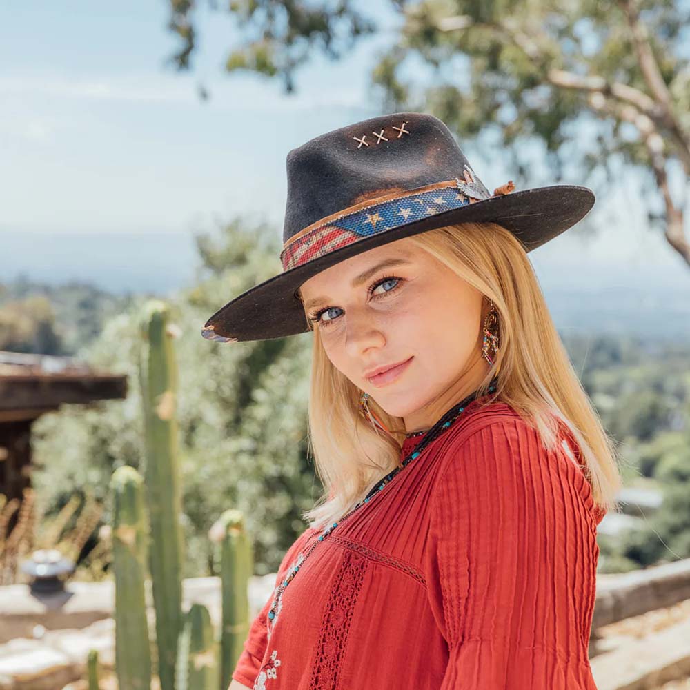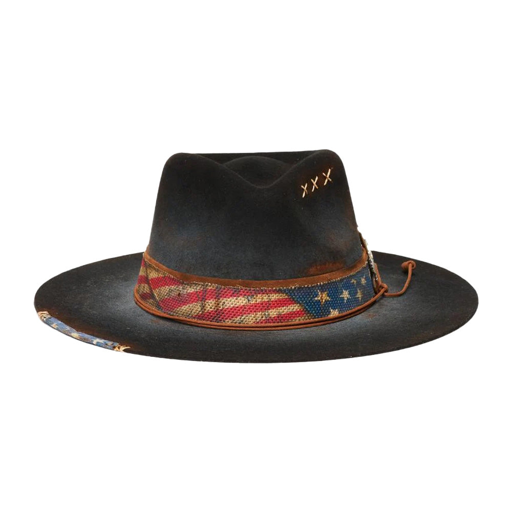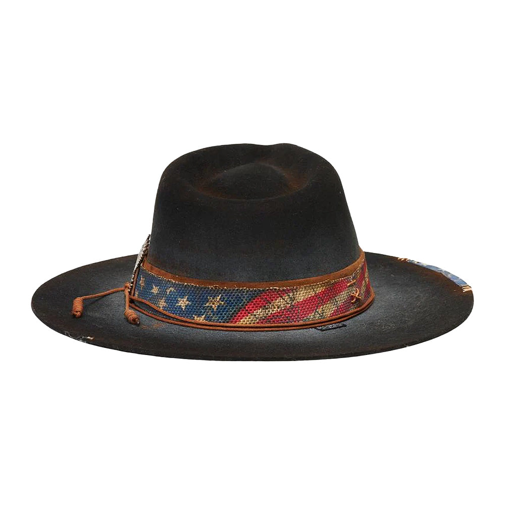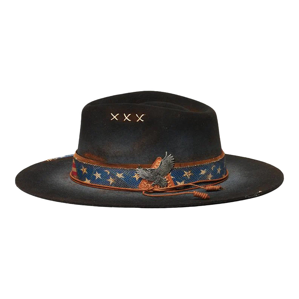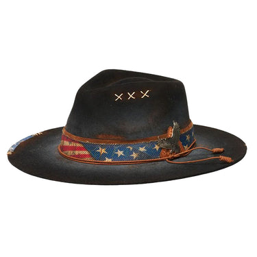 Introducing Stampede Hats' Ameri Felt Flat Brim Hat, crafted with 100% wool felt for a luxurious touch. It features a 3 1/2 inch brim providing ample sun protection. Adorned with a classic American flag band and a metal eagle detail on the side, this hat is the perfect balance of sophistication and Americana.