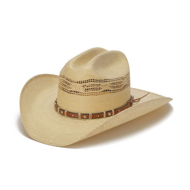 From the Stampede Hats collection, this hat is made of 50X Bangora Straw in a beige color for a natural look. For those who prefer some airflow in their cowboy hats, this is a great choice as it features many vent holes all around the crown. The band is the real special part of this hat, with details all around including a texture pattern, studding, and tie wrap accents.