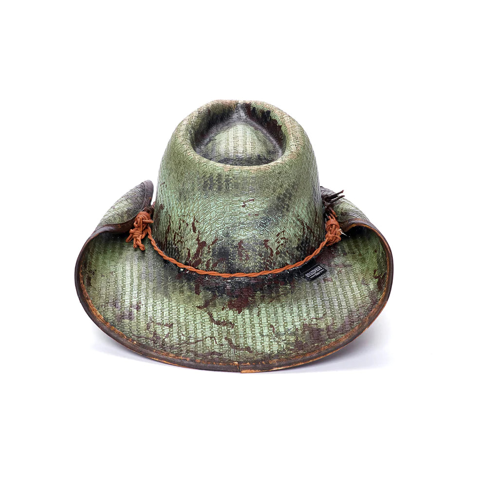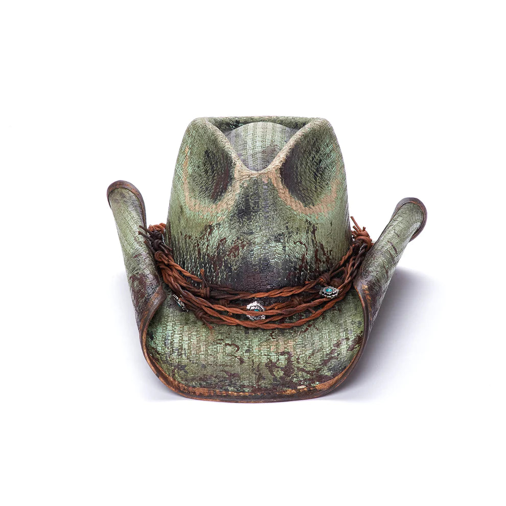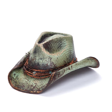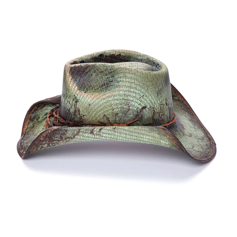 Say Hasta La Vista to boring hats with this Stampede Hats Cowboy Hat. Crafted from premium canvas, it comes trimmed with braided leather cords and mini buckles giving the appearance of barbed wire. The 3.75 inch brim will keep your face shaded and the worn design will make it look like it's been your trusty hat for some time.
