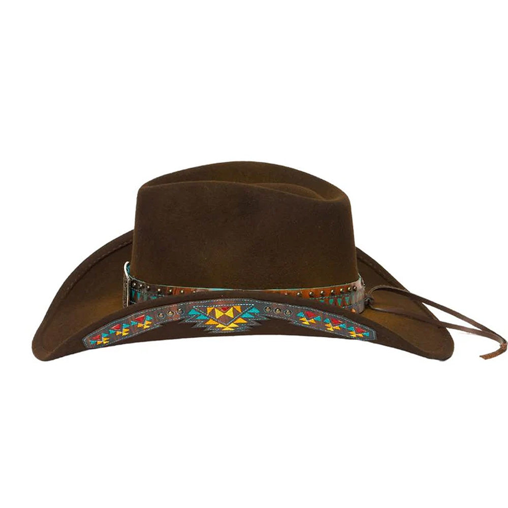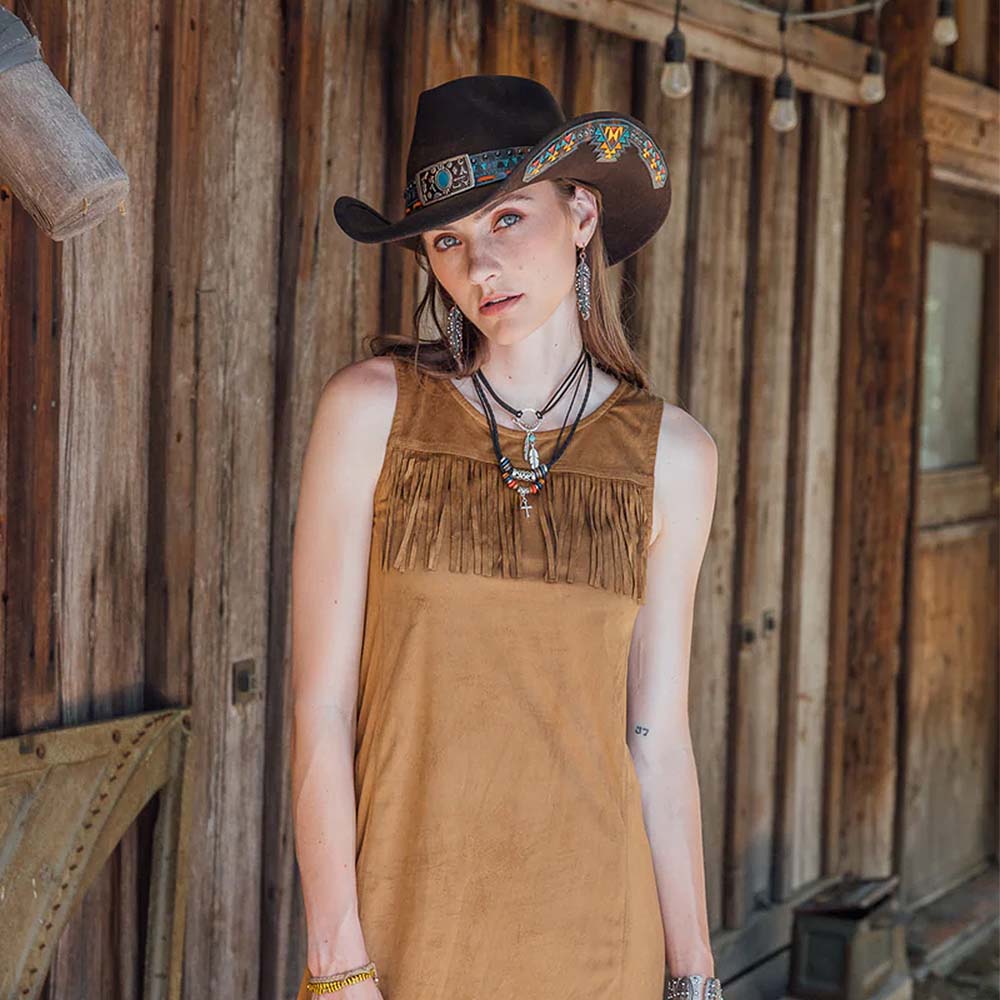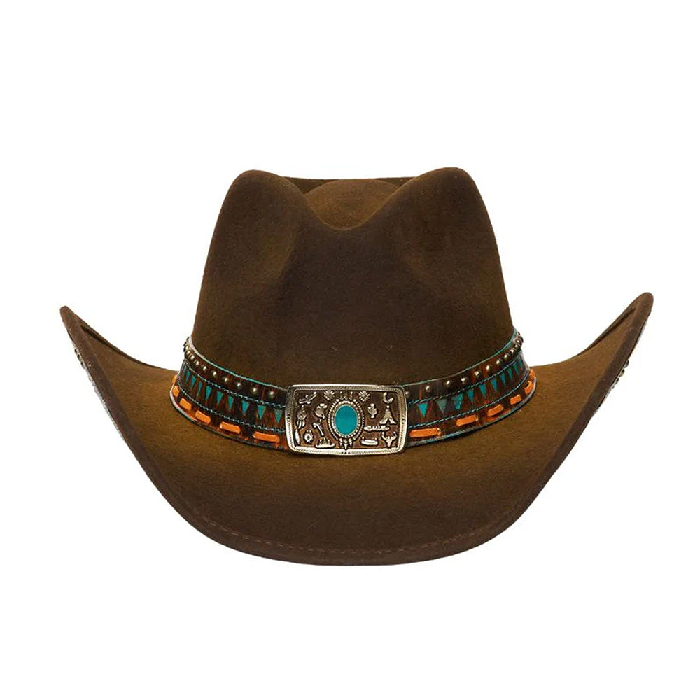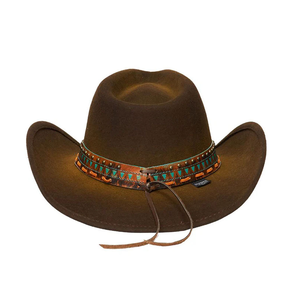 Discover the wild west with the Mae Cowboy Hat. Experience expert craftsmanship and comfort with this wool hat. The dark brown stain body and turquoise details add a touch of rugged charm. Inspired by Navajo patterns, the 4 inch brim gives sun protection while making a statement.