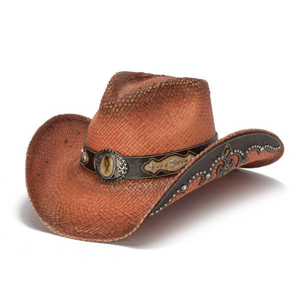 A wonderful alternative to the traditional coloring of western hats. Made with genuine panama straw, this hat is lightweight and durable. The Orange Rhinestone Stampede hat features a muted orange color with leather band and leather trim on the underside of the brim. There are also rhinestones throughout and a light-colored stone on the front center metal buckle.