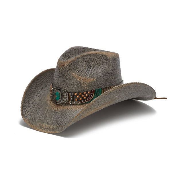 The Stampede Hats Studded Turquoise Blue Stone hat is a great take on the cowboy hat. This hat features genuine panama straw material and a large turquoise blue stone center piece mounted on a stylishly distressed and multicolored band with studding detail. This hat also has the following: